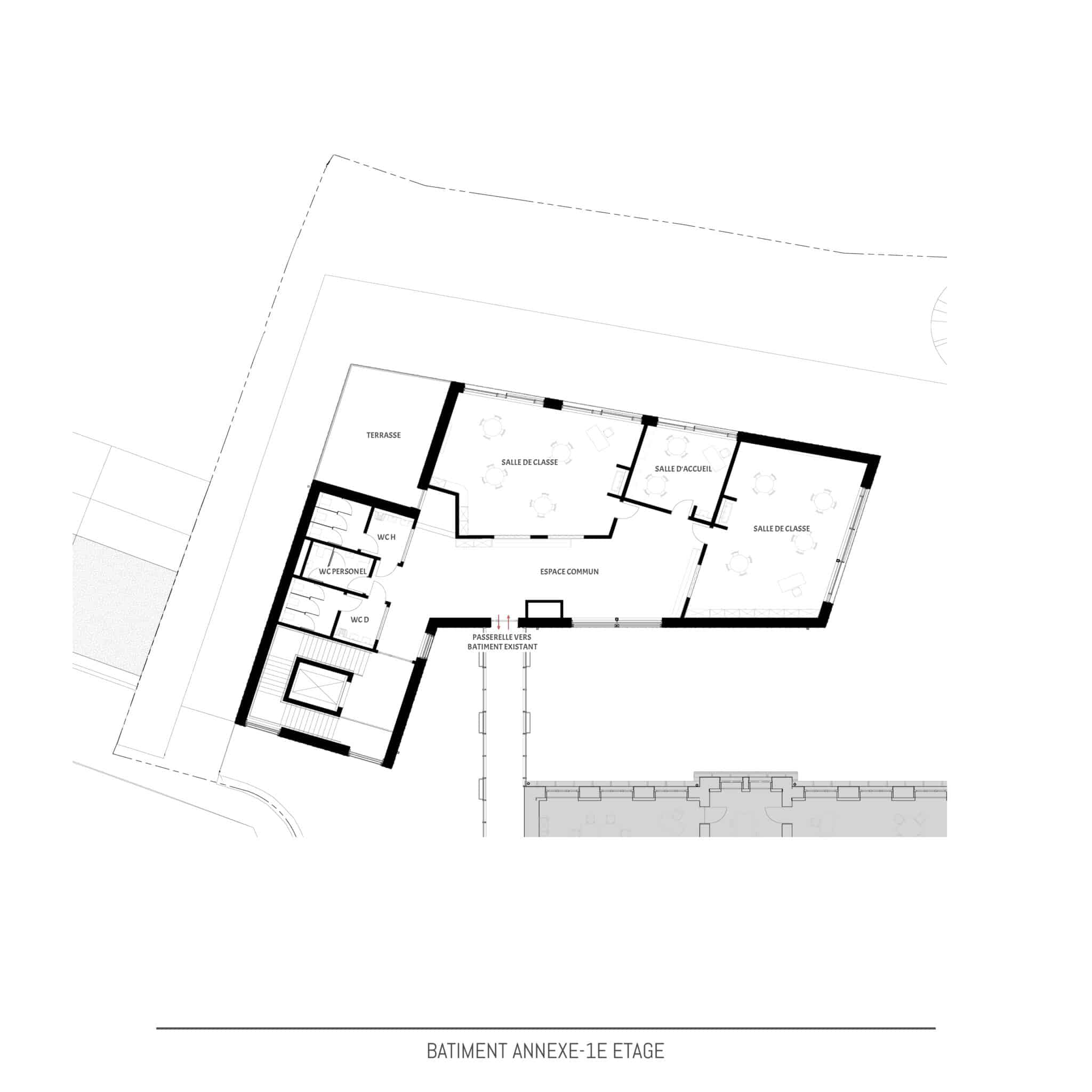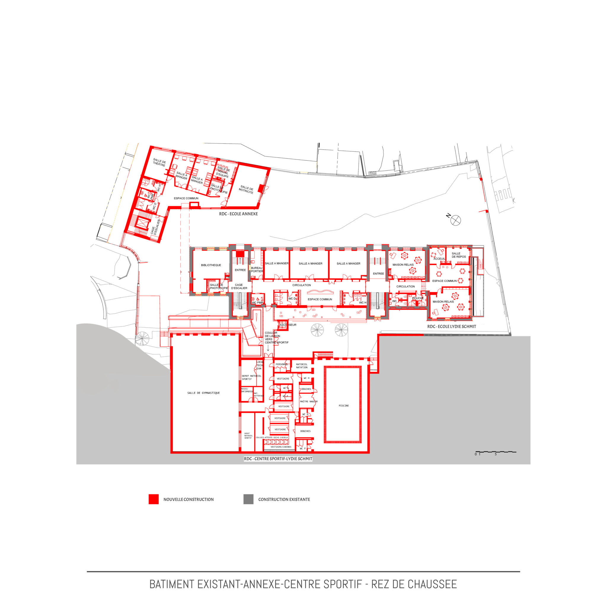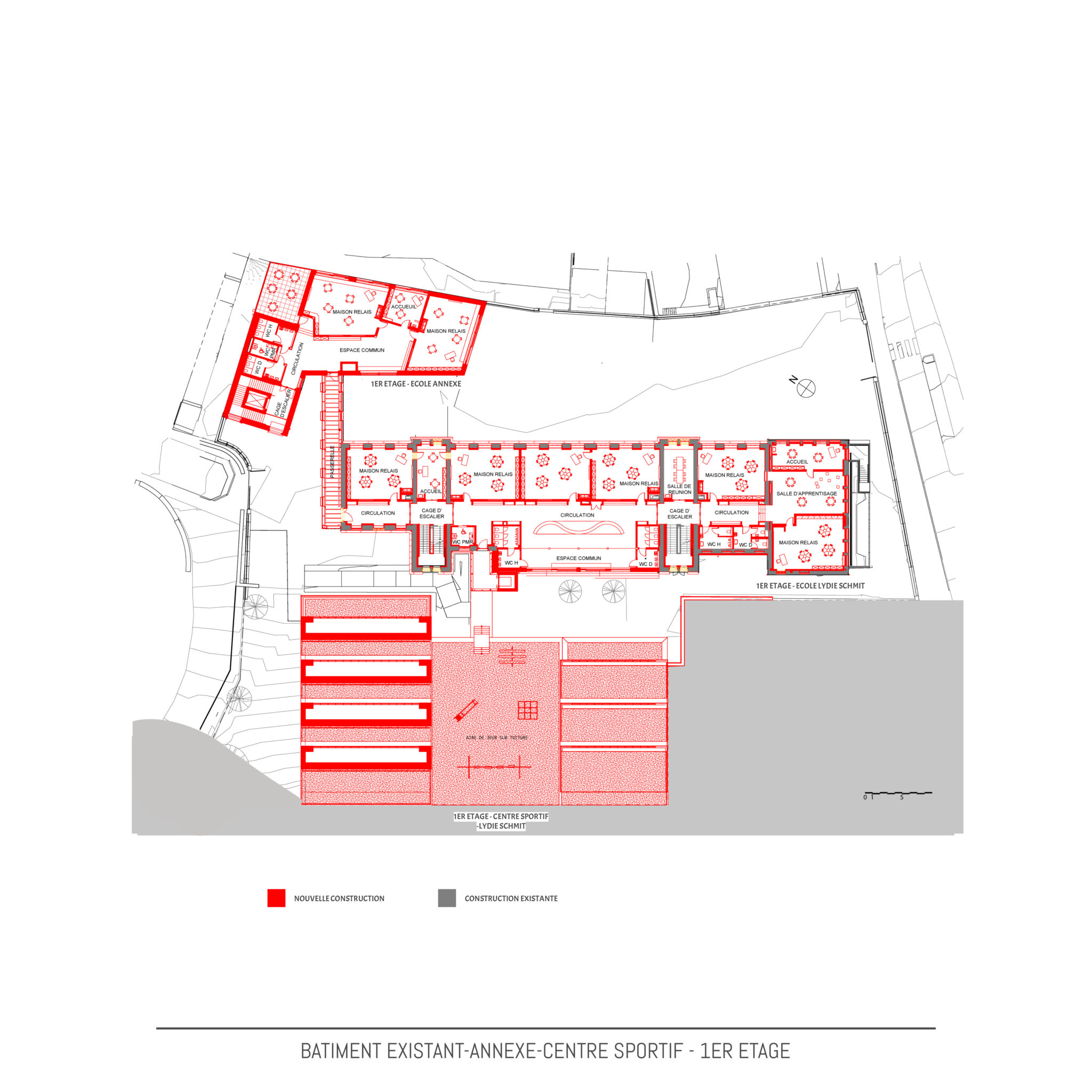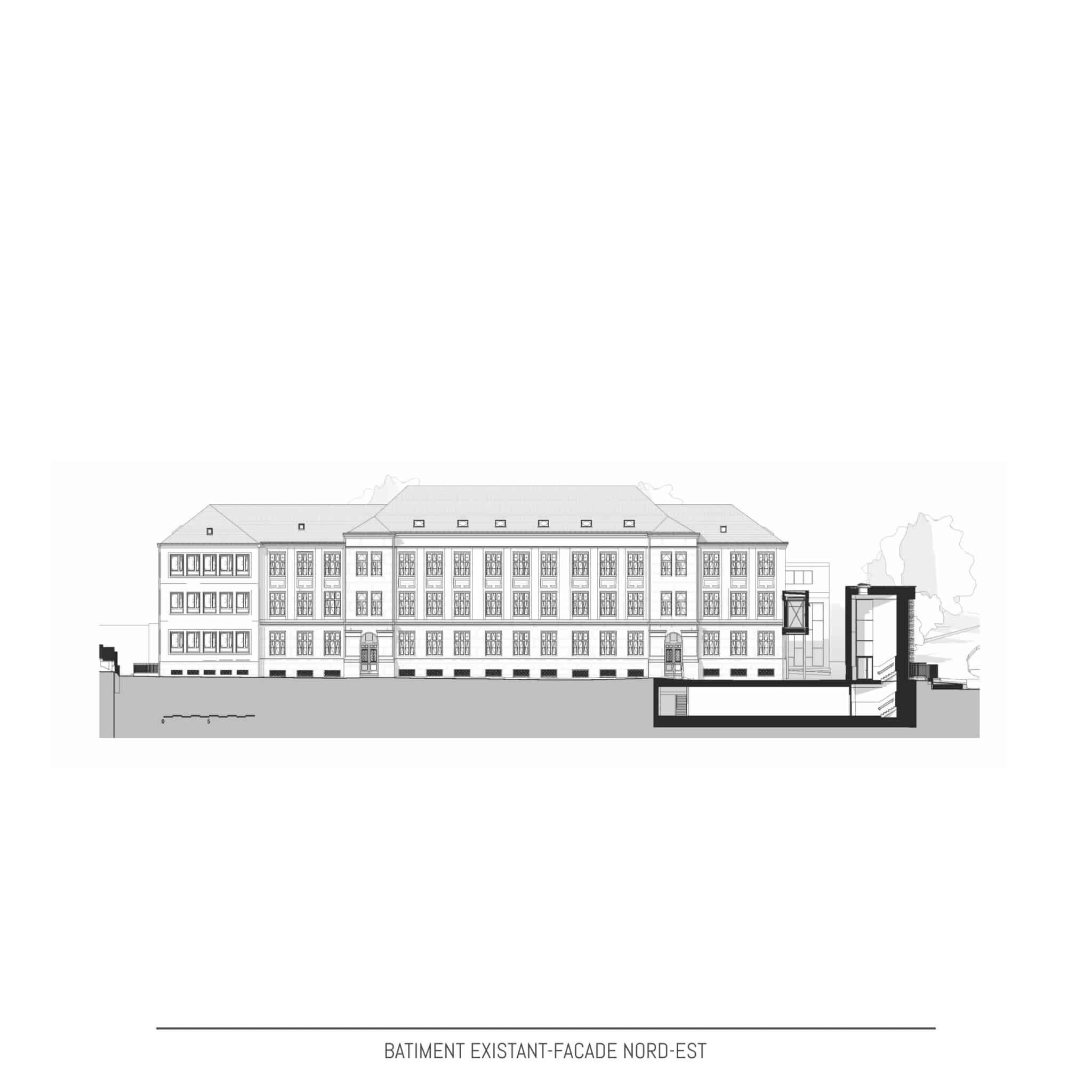 Actuellement les terrains sont occupés par le bâtiment principal dont les origines datent de ±1910, une extension des années 1960 et une annexe avec piscine et hall sportif construites de 2013 à 2015. En 2021, le bâtiment principal est classé « Monument national » par l’Institut National du Patrimoine Architectural. Le bâtiment principal subira une rénovation et transformation complète sur toutes les étages en étroite collaboration avec l’Institut National du Patrimoine Architectural. Le projet de la nouvelle annexe à l’école Lydie Schmit se situera sur l’extrémité nord du terrain et occupera une partie de la cour de récréation actuelle. Le nouveau bâtiment remplacera en partie le mur de soutènement existant et créera une liaison directe entre le niveau cour de récréation et les jardins actuels en contrebas du mur de soutènement. Ces jardins seront intégrés en partie dans le projet et présenterons des nouveaux espaces extérieurs pour les classes au rez-de-jardin. Le nouveau bâtiment annexe s’étendra sur 3 niveaux dont le rez-de-chaussée au niveau de la cour de récréation actuelle, un rez-de-jardin au niveau des anciens jardins et un 1er étage au même niveau que 1er étage du bâtiment existant avec passerelle de liaison à ce niveau entre la nouvelle annexe et le bâtiment existant. Le bâtiment de piscine et de hall de sports ne subira aucune modification et restera en service durant les travaux.Conception | Construction | Matériaux