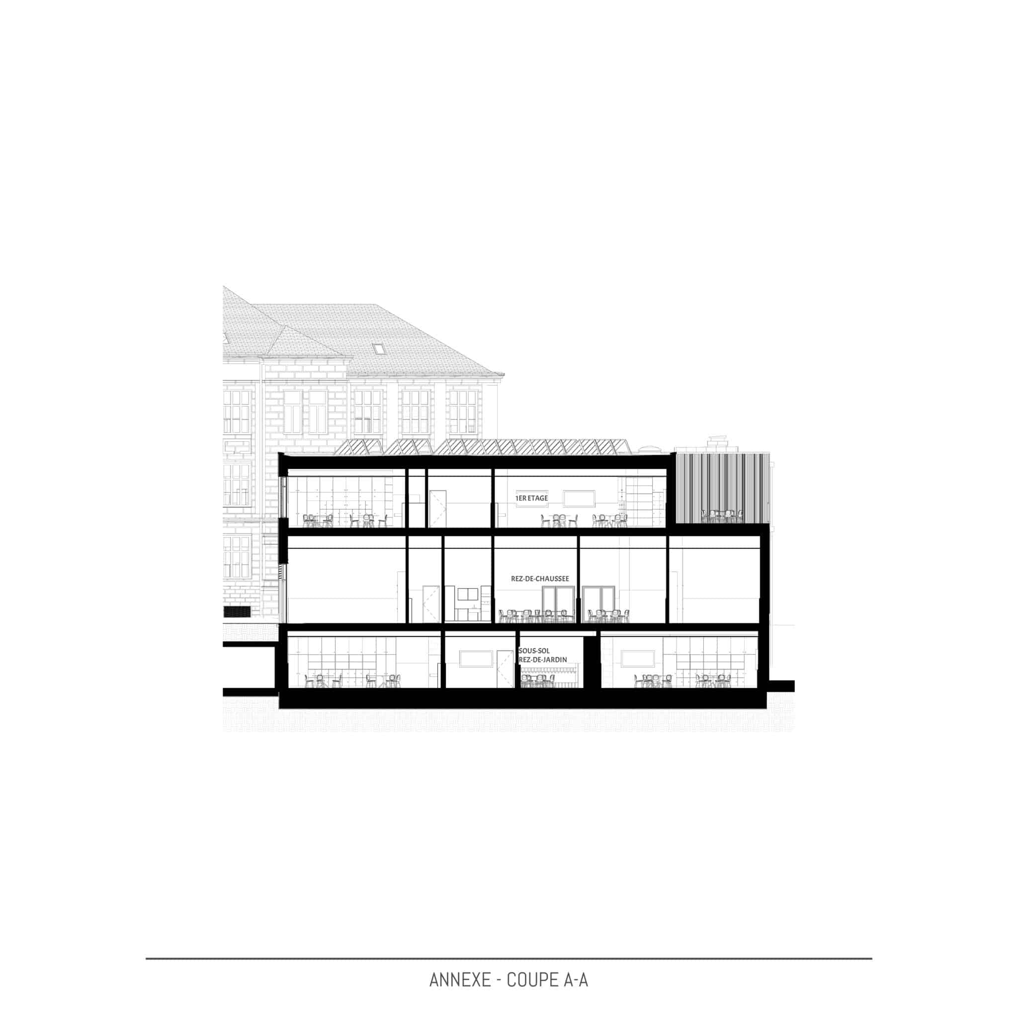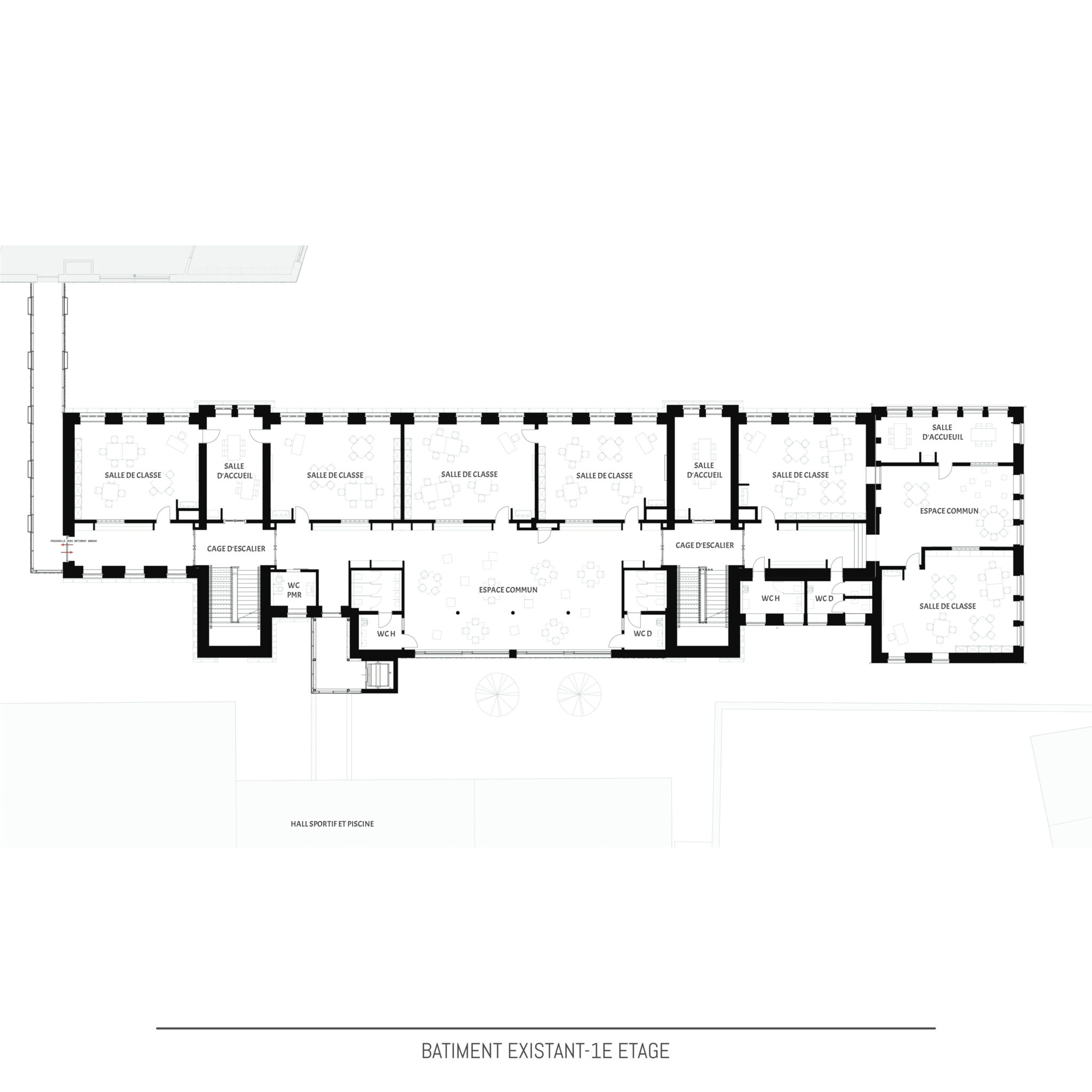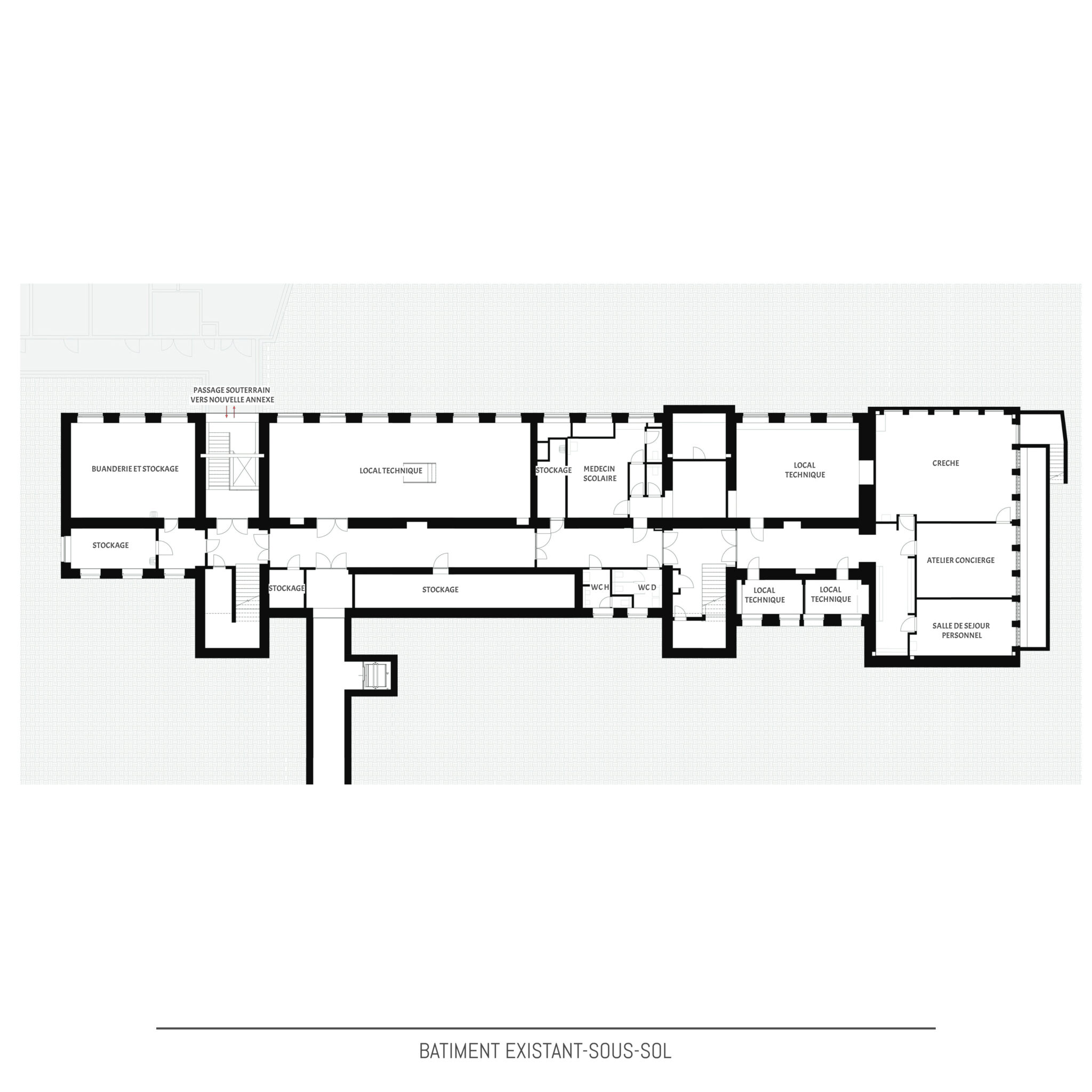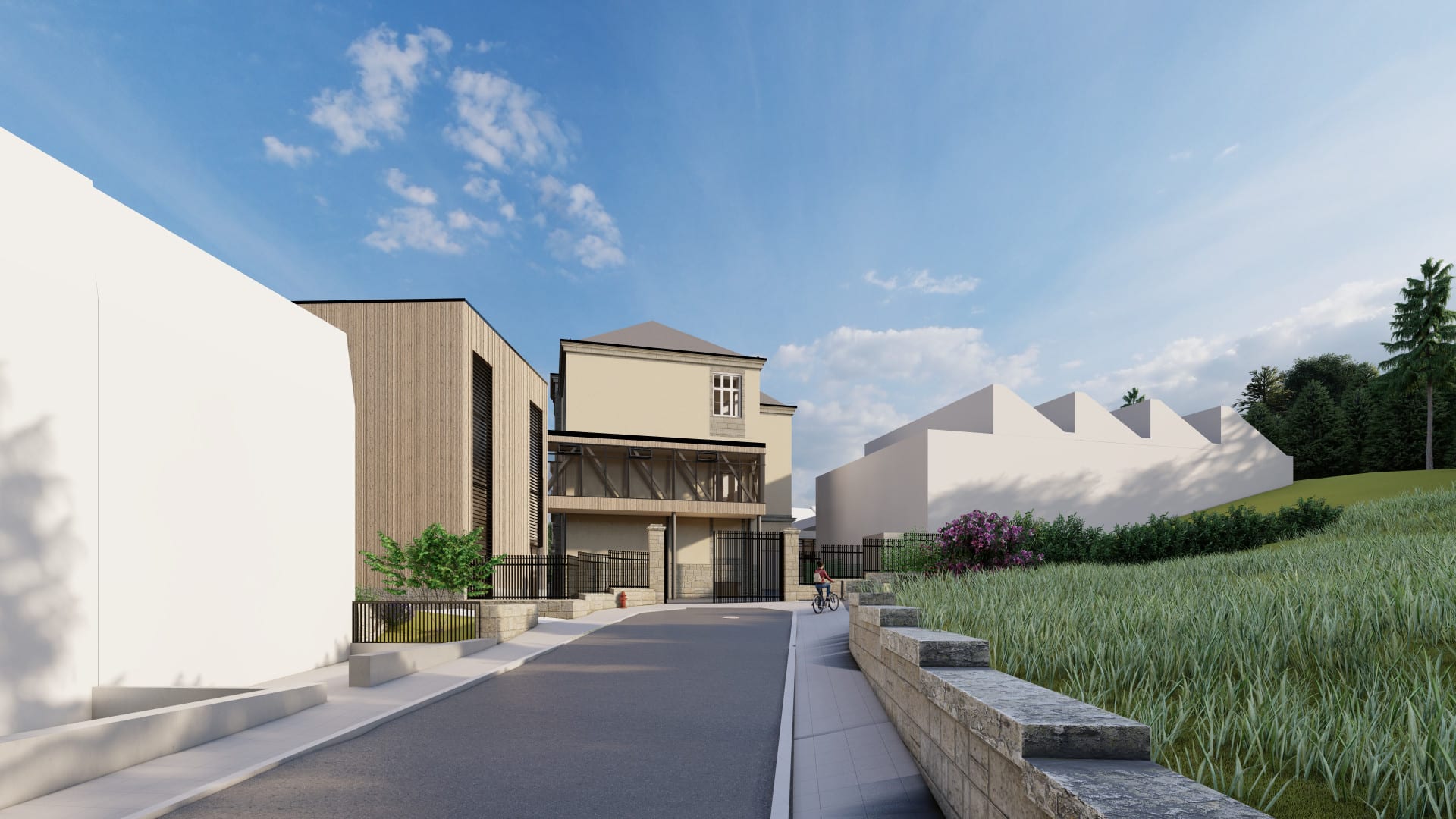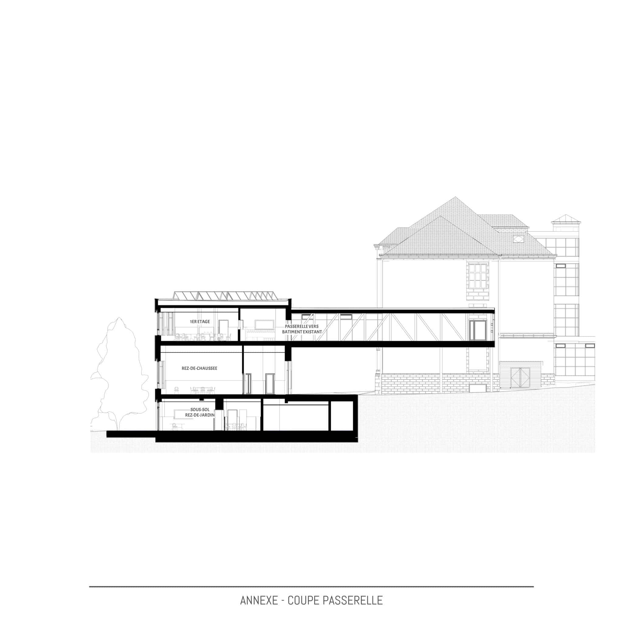 Actuellement les terrains sont occupés par le bâtiment principal dont les origines datent de ±1910, une extension des années 1960 et une annexe avec piscine et hall sportif construites de 2013 à 2015. En 2021, le bâtiment principal est classé « Monument national » par l’Institut National du Patrimoine Architectural. Le bâtiment principal subira une rénovation et transformation complète sur toutes les étages en étroite collaboration avec l’Institut National du Patrimoine Architectural. Le projet de la nouvelle annexe à l’école Lydie Schmit se situera sur l’extrémité nord du terrain et occupera une partie de la cour de récréation actuelle. Le nouveau bâtiment remplacera en partie le mur de soutènement existant et créera une liaison directe entre le niveau cour de récréation et les jardins actuels en contrebas du mur de soutènement. Ces jardins seront intégrés en partie dans le projet et présenterons des nouveaux espaces extérieurs pour les classes au rez-de-jardin. Le nouveau bâtiment annexe s’étendra sur 3 niveaux dont le rez-de-chaussée au niveau de la cour de récréation actuelle, un rez-de-jardin au niveau des anciens jardins et un 1er étage au même niveau que 1er étage du bâtiment existant avec passerelle de liaison à ce niveau entre la nouvelle annexe et le bâtiment existant. Le bâtiment de piscine et de hall de sports ne subira aucune modification et restera en service durant les travaux.Conception | Construction | Matériaux