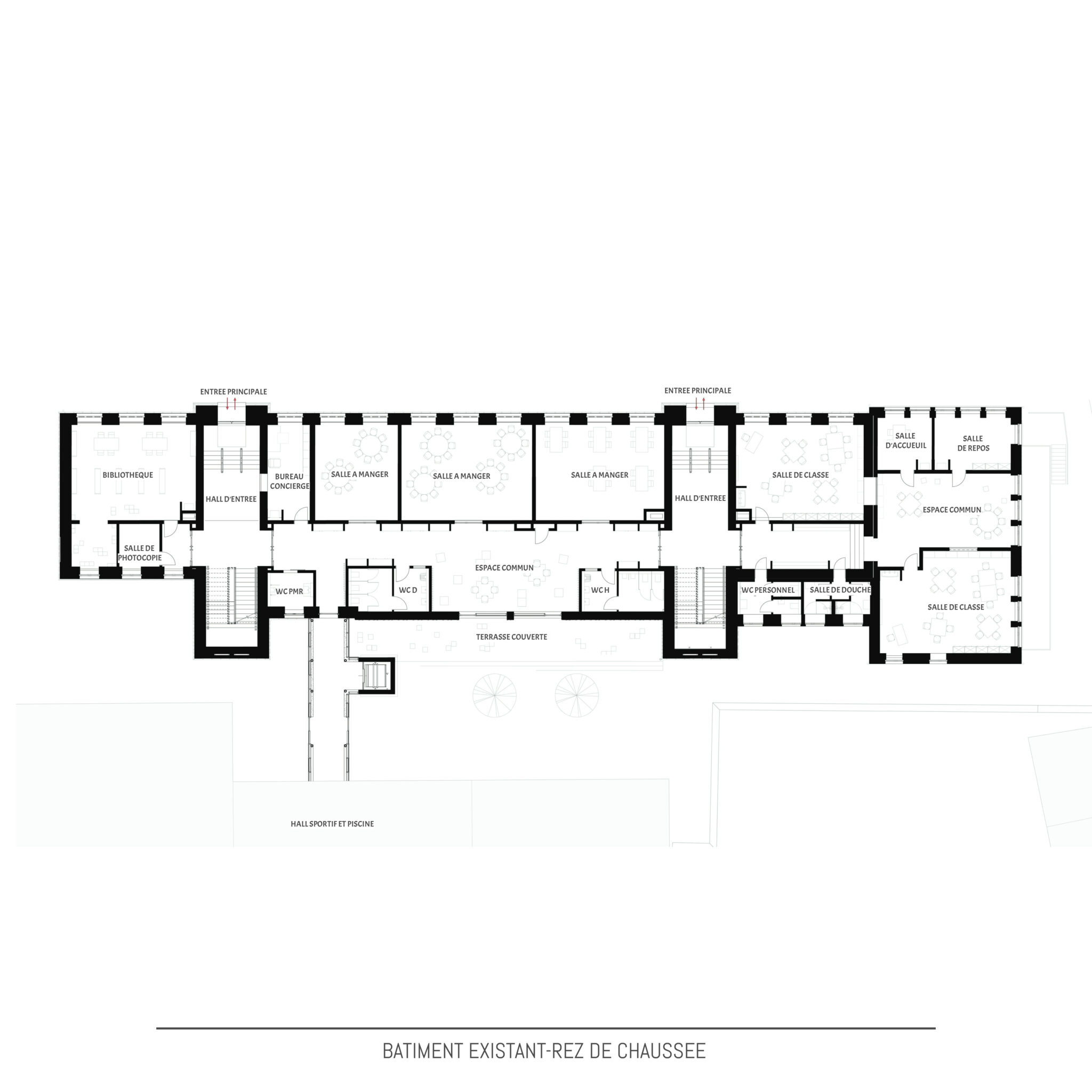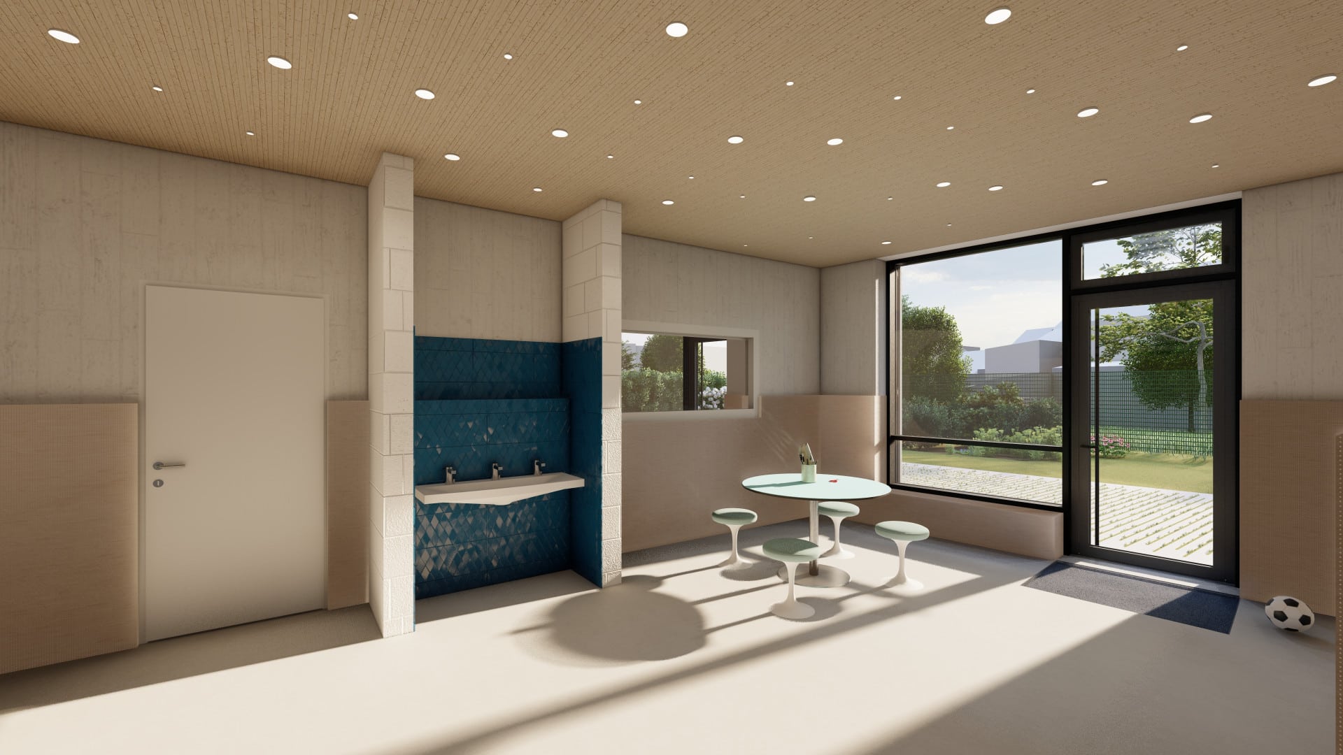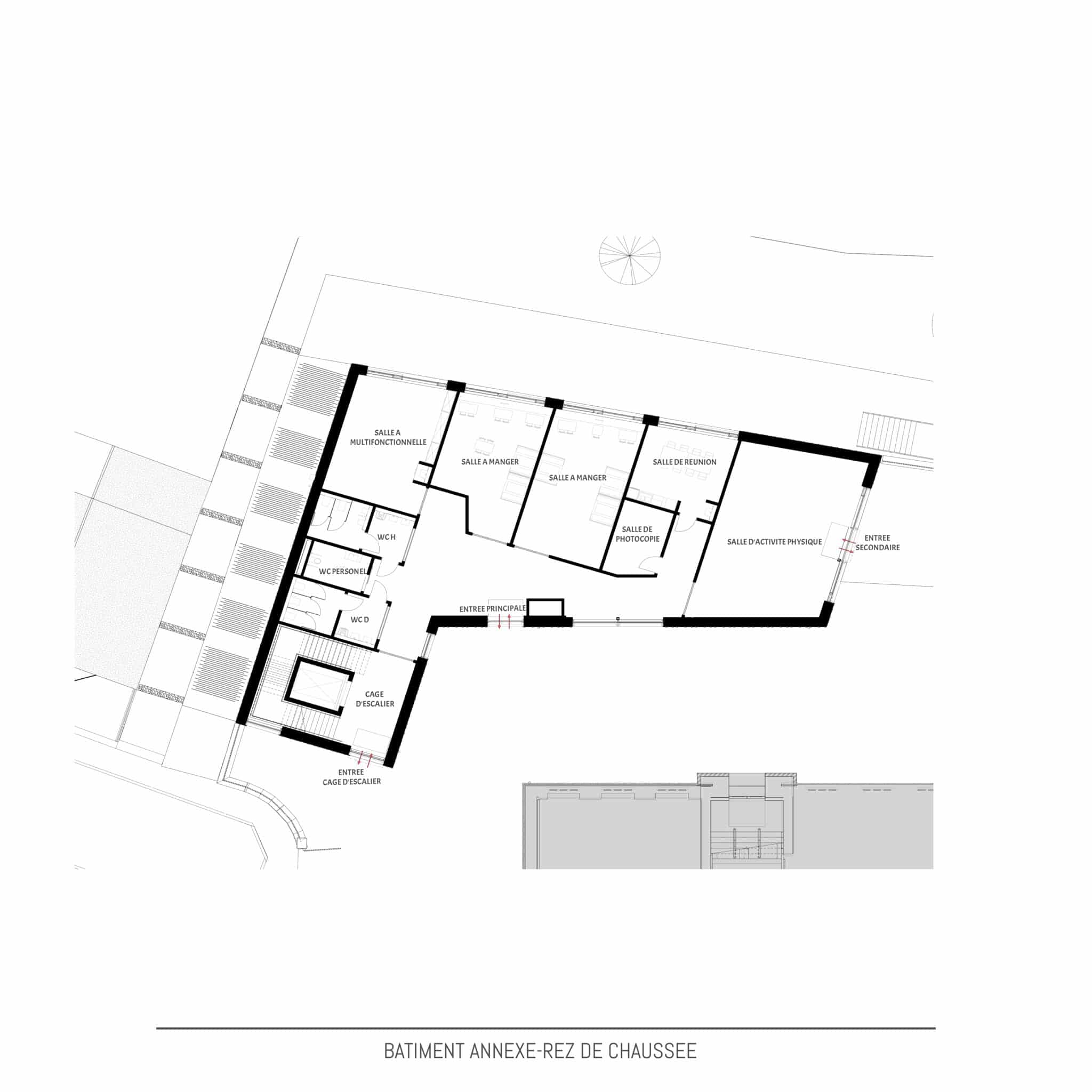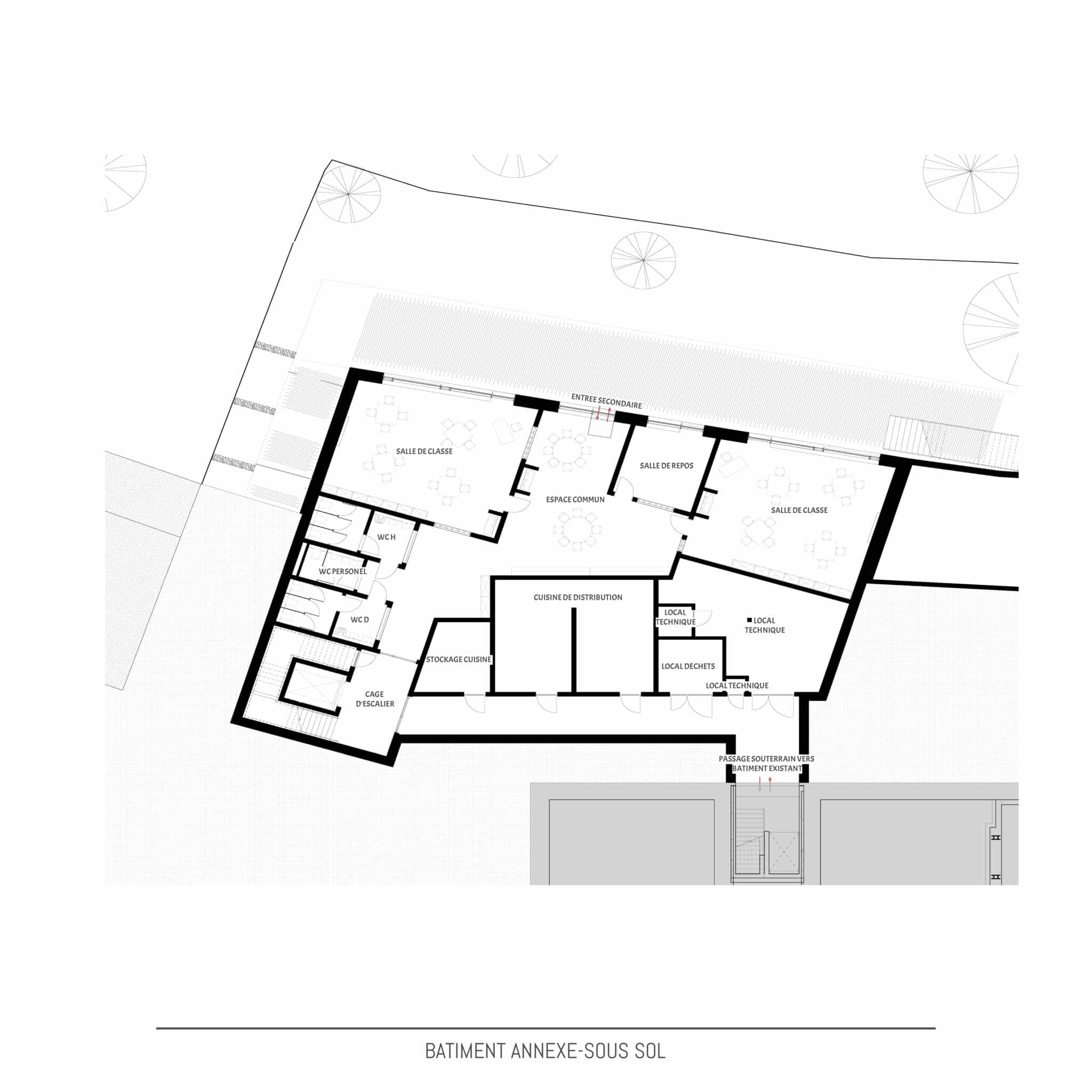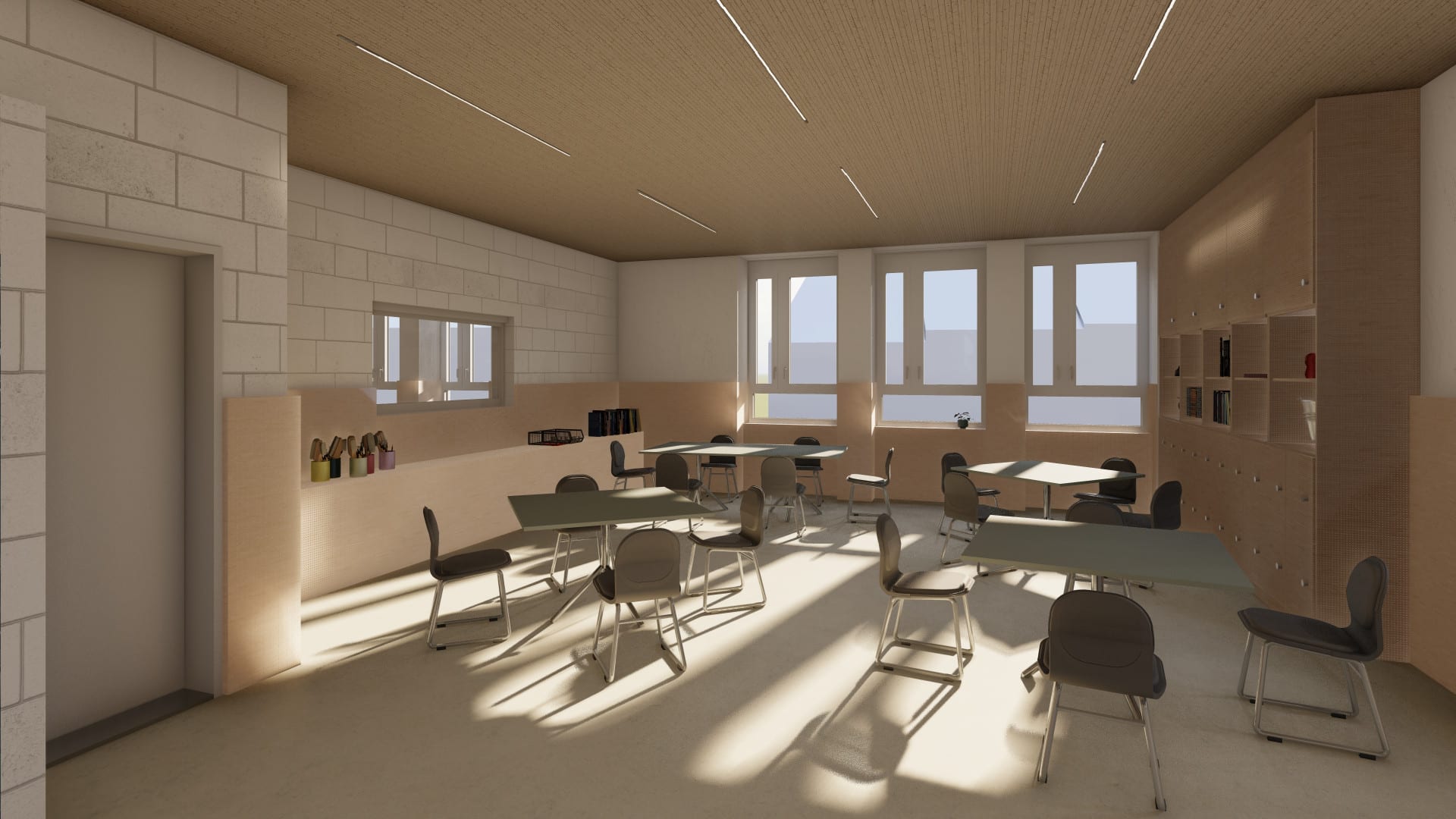 - Aménagements extérieurs : Aménagement nouvelle cour de récréation | Création d’une pente vers la nouvelle cour de récréation | Création d’une bande de verdure le long de la pente descendant vers la nouvelle cour de récréation, stabilisé par des gabions | Création d’un espace stockage en dessous de la cour de récréation actuelle
