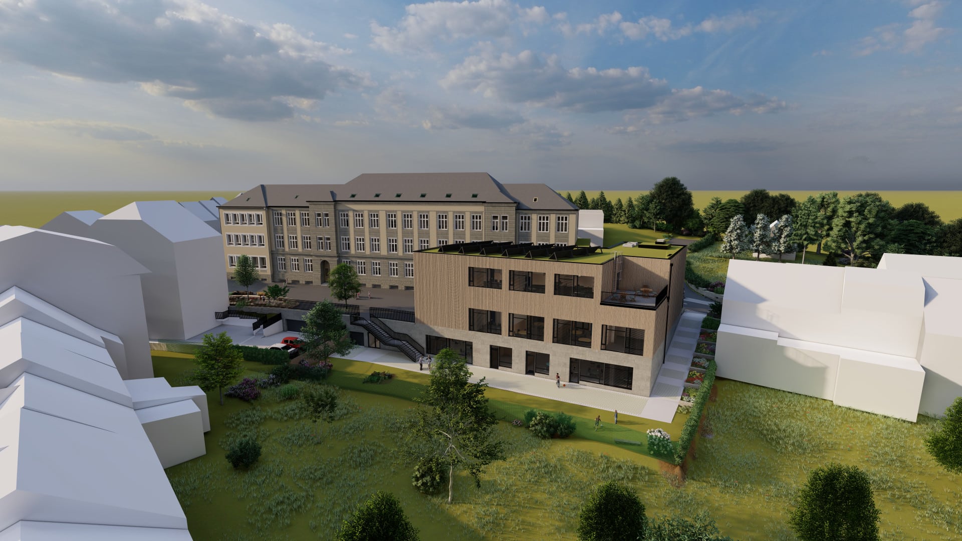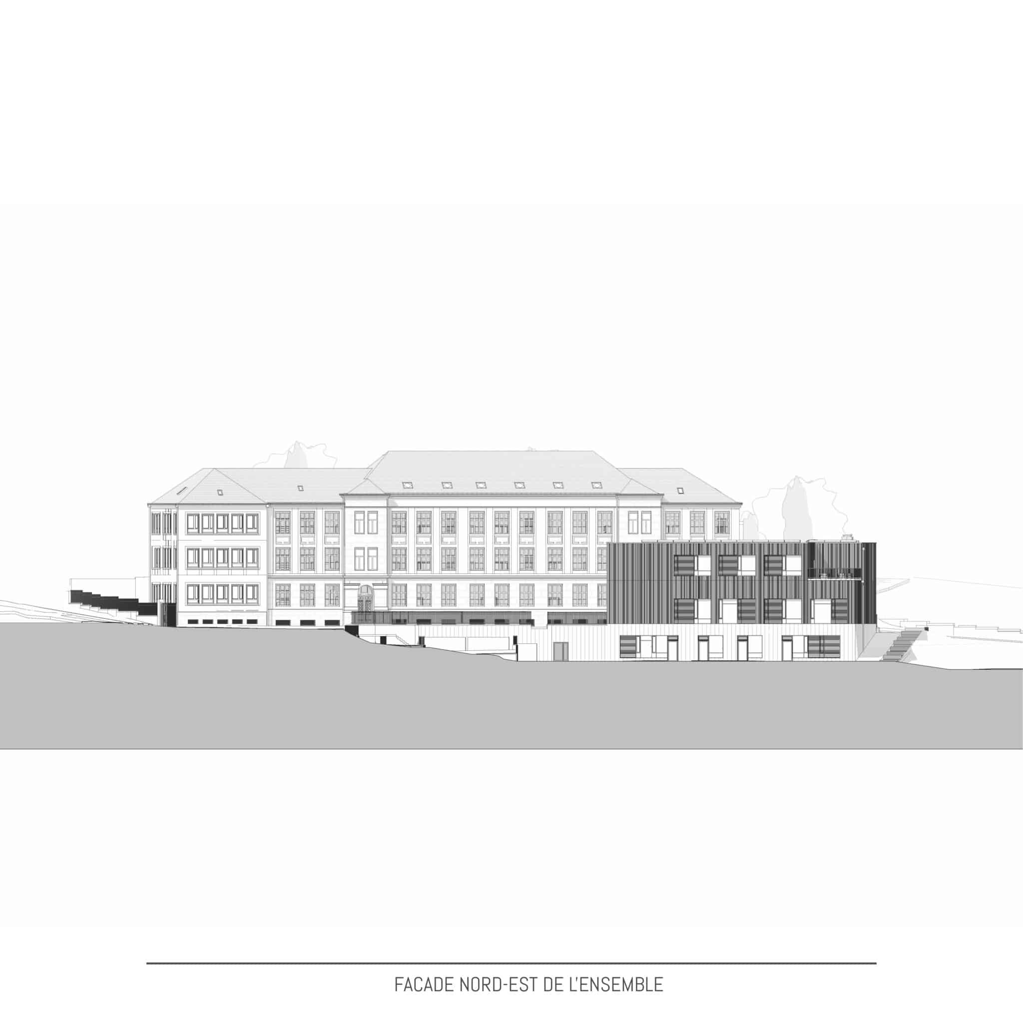 Transformation, rénovation et assainissement structurel et énergétique du bâtiment centenaire existant | Construction d’un bâtiment annexe, classe énergétique A-A-A Temps de construction: 2021 à 2024 | Coûts de construction: 21.120.000.- € | Volume brut: +- 27 700 m3 | Surface brute: +- 6 909 m2Bref descriptif
