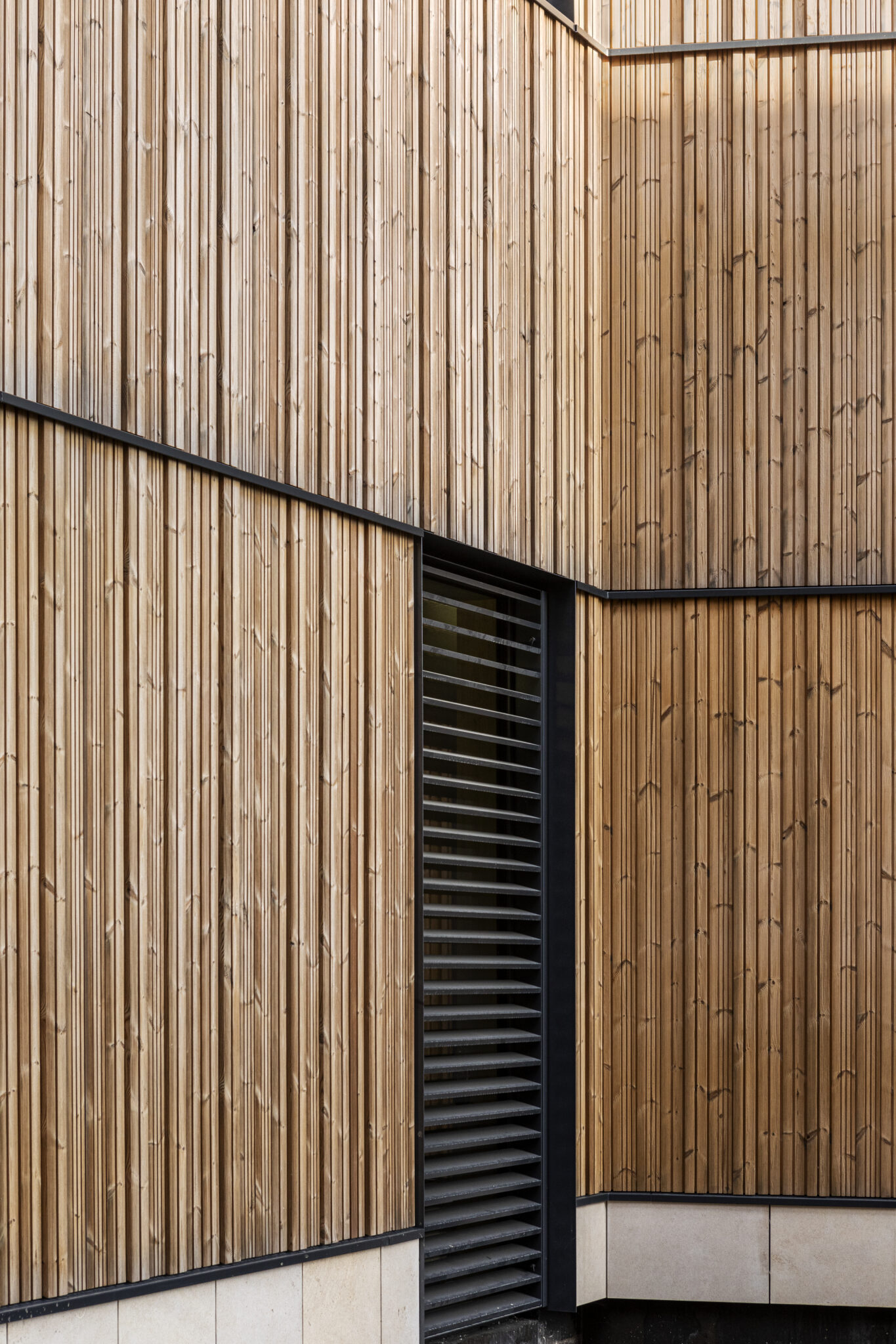 - Structure et enveloppe du bâtiment: Structure portante du sous-sol en béton armé | Cloisons en maçonnerie silico-calcaire | Isolation thermique enterrée en panneaux en mousse de verre | Construction hors sol du bâtiment en bois massif | Cloisons intérieures en bois massif | Isolation thermique de façade en ouate de cellulose | Revêtement de façade en Pin du Nord Thermo, PEFC | Menuiseries extérieures bois-aluminium | Stores fixes | Stores réglables en aluminium